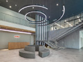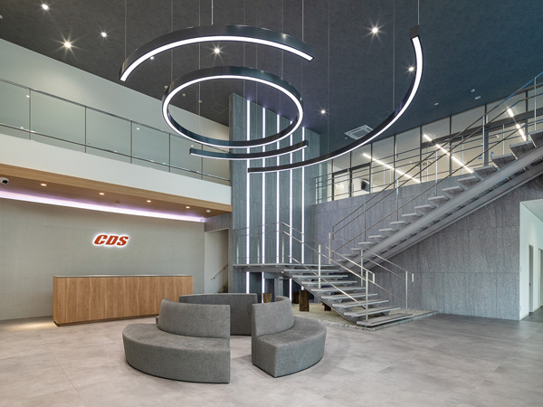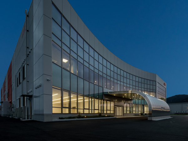 ファサードは旧本社工場のカーテンウォールと山口県のオレンジ色を基調としたデザインを踏襲しています。