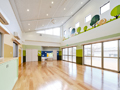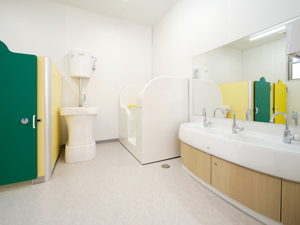 運動公園の隣接側にプレイルーム・運動場を設け、そのエリアを核として各保育室を配置しました。特にプレイルームの意匠はこだわりの逸品。床暖房、高い傾斜天井の3方から採光を取り、カラフルな色彩や象さんのサインをアクセントに開放的で楽しい空間としました。