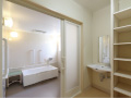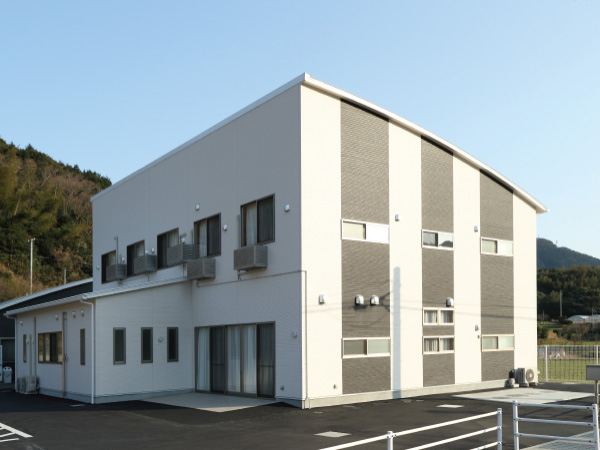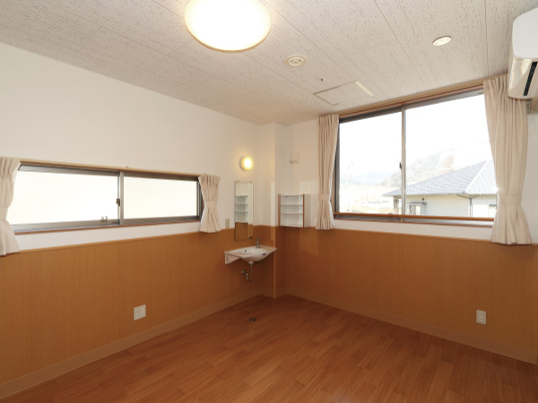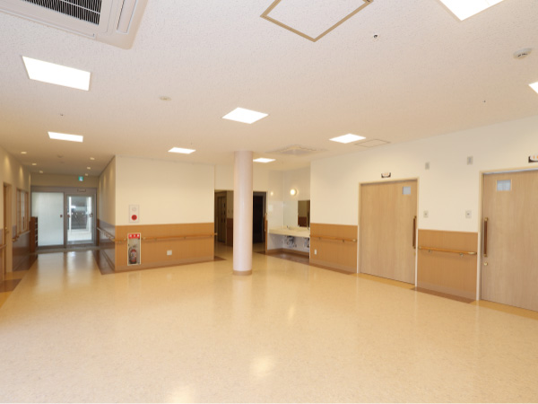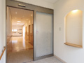 個室から居間を経由して玄関に出る動線を作りその入所者を見守れる位置に事務室を配置しています。
